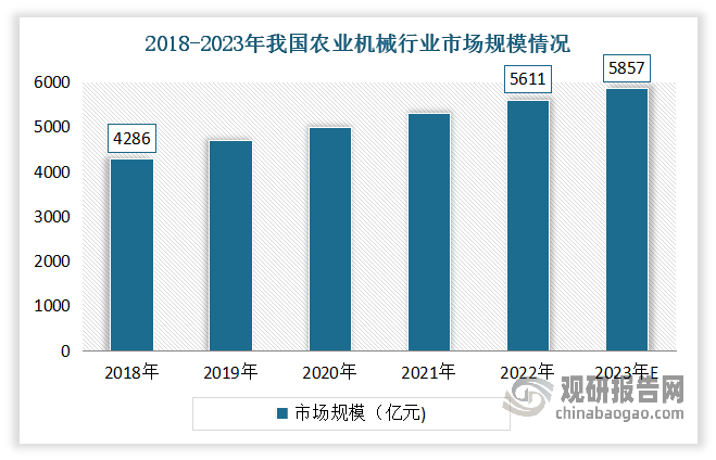农业机械化是实现农业现代化和确保国度粮食平安不成或缺的物质根本,也是农业现代化的主要标记。当前正在我国处于从保守农业向现代农业改变的环节期间鄙人,推进农业机械化和农机工业成长,对于提高农业配备先辈性、改善农业出产前提、加强农业分析出产能力和拉动农村消费需求具有主要意义。近年来正在《农业机械化推进法》、农机购买补助等一系列搀扶政策推进下,我国农业机械化取得了快速成长,实现质的飞跃,不只无效鞭策了国内农机配备程度和农业机械化程度的提拔,并且还支持农业各财产成长的机械化根本逐渐安稳。具体如下:市场不竭扩大。数据显示,2018-2022年我国农业机械行业市场规模由4286亿元增加至5611亿元,年均复合增加率达8。4%。估量2023年我国农业机械市场规模将正在5857亿元摆布。